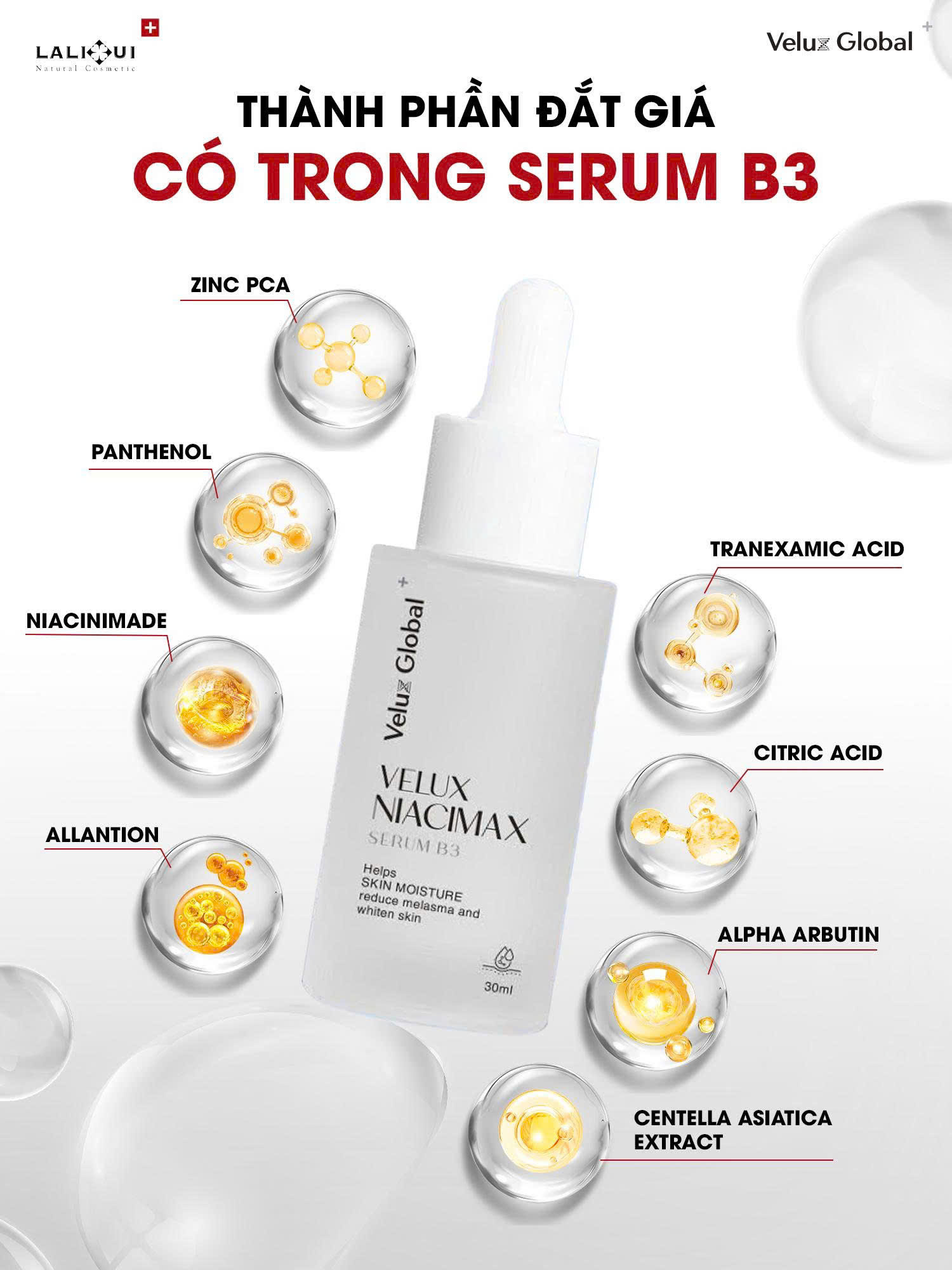 Niacinamide 15% (Vitamin B3) Giảm thâm – làm đều màu da Củng cố hàng rào bảo vệ da Hỗ trợ giảm mụn, giảm tiết dầu Tăng sinh collagen, làm da săn chắc Tranexamic Acid Ức chế hình thành melanin Hỗ trợ mờ nám, tàn nhang, thâm sau mụn Phục hồi da tổn thương do UV Alpha Arbutin Làm sáng da an toàn Hỗ trợ giảm sạm, đốm nâu Hiệu quả tốt khi kết hợp Niacinamide & TXA Panthenol (Vitamin B5) Làm dịu nhanh da kích ứng Phục hồi hàng rào da Giữ ẩm, giảm bong tróc Allantoin Làm dịu, giảm đỏ rát Hỗ trợ tái tạo da Centella Asiatica Extract (Rau má) Giảm viêm, giảm mụn Kích thích phục hồi và tái tạo da Zinc PCA Kiểm soát dầu thừa Hỗ trợ giảm mụn, giảm viêm Glycerin Propanediol Butylene Glycol 1,2-Hexanediol